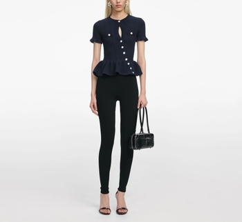 네이비 리브 니트 페플럼 탑 W/키홀 컷 아웃 & 비대칭 버튼 | OEKO-TEX 인증 | 모델 PK-ASY24