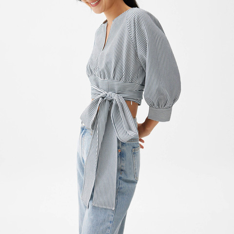 Tùy Chỉnh ODM OEM Của Phụ Nữ Màu Xanh Sọc Áo Bọc Thiết Kế V Cổ Ngắn Chiều Dài Áo Sơ Mi